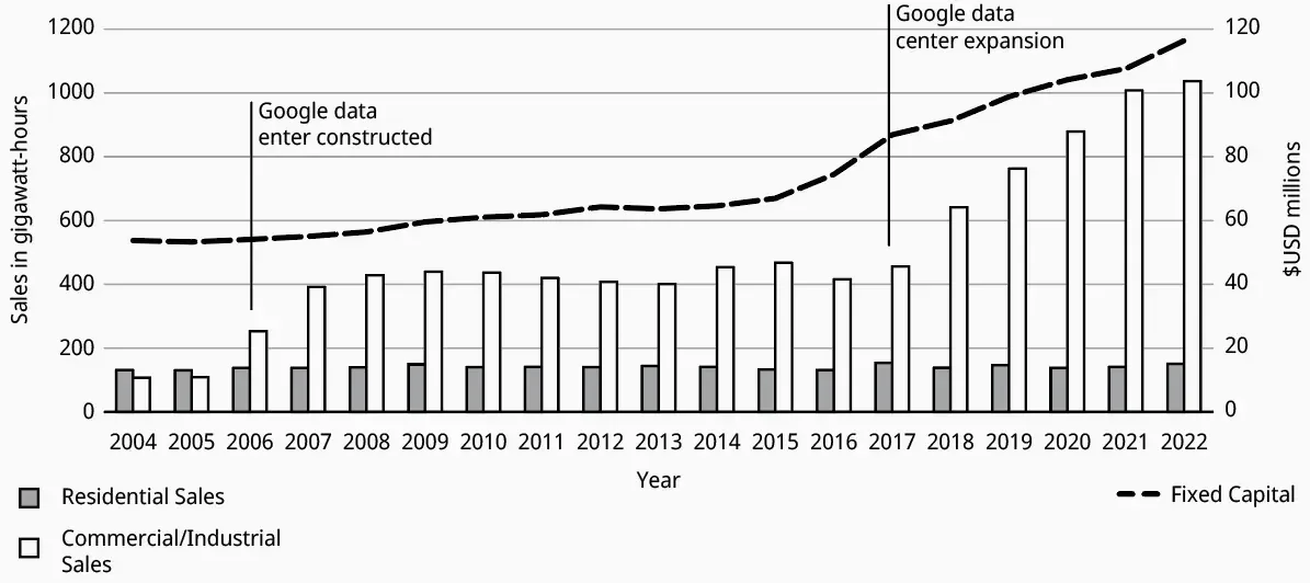Commercial and industrial users, however, were on a different trajectory entirely. In 2016, they accounted for $21.6 million in revenue, making up about 67% of NWCPUD’s income. By 2021, that figure had more than doubled to $48.3 million—now 81% of total revenue. The primary driver? Google, whose data center operations had expanded to five facilities, with a total investment of $1.8 billion. By 2023, total revenues for commercial and industrial sectors soared to $80.9 million, now 84% of all income. Residential revenues, meanwhile, barely moved, sitting at $11 million, or just 11% of the total.2 Even as residential rates ticked down slightly, the shift in energy demand was unmistakable.
