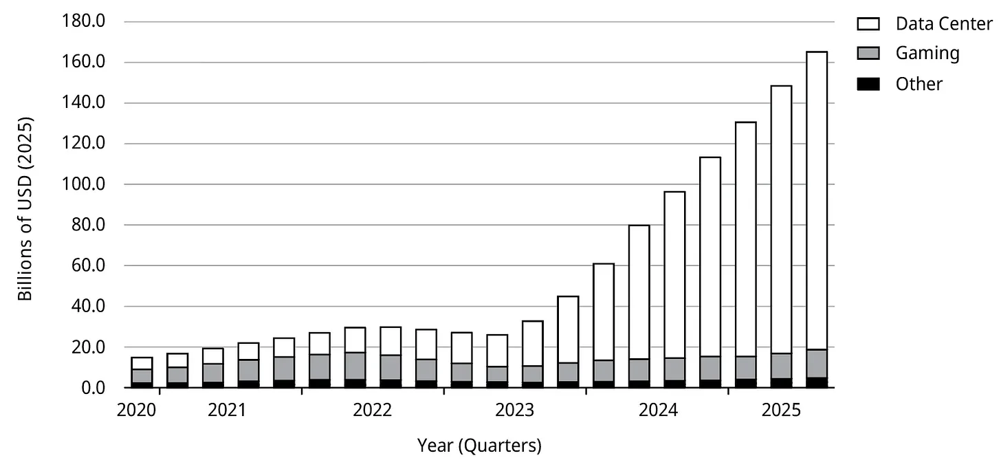 Data center revenue rose from under $6 billion per quarter in 2020 to more than $147 billion by Q3 2025, accounting for nearly 90% of total revenue. Gross margins hovered around 73%, with operating margins close to 60%. Free cash flow exceeded $25 billion each quarter, supporting stock buybacks of more than $60 billion. Yet this success rests on a narrow customer base. Nearly 40% of data center revenue came from just two buyers—widely believed to be Microsoft and Meta—and about half from hyperscalers overall. The remainder was buoyed by sovereign-backed projects in Europe, the Middle East, and Asia, along with U.S. government procurement.