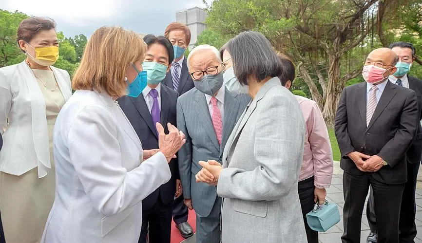 Then-President Tsai Ing-wen (right) speaks with U.S. House Speaker Nancy Pelosi (left) as Vice President William Lai and TSMC founder Morris Chang look on in Taipei, 2022. Photo from President Tsai Ing-wen’s Facebook page.