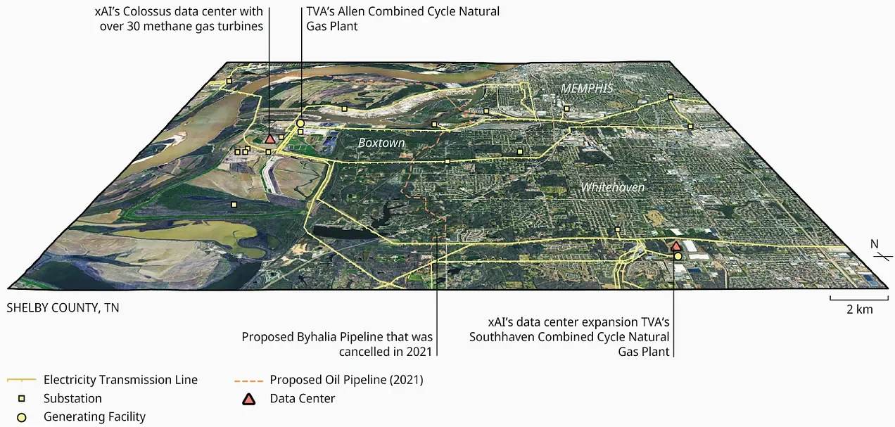 Territoriality of xAI’s Data Centers in South Memphis, TN. Data sources: HIFLD, Maxar