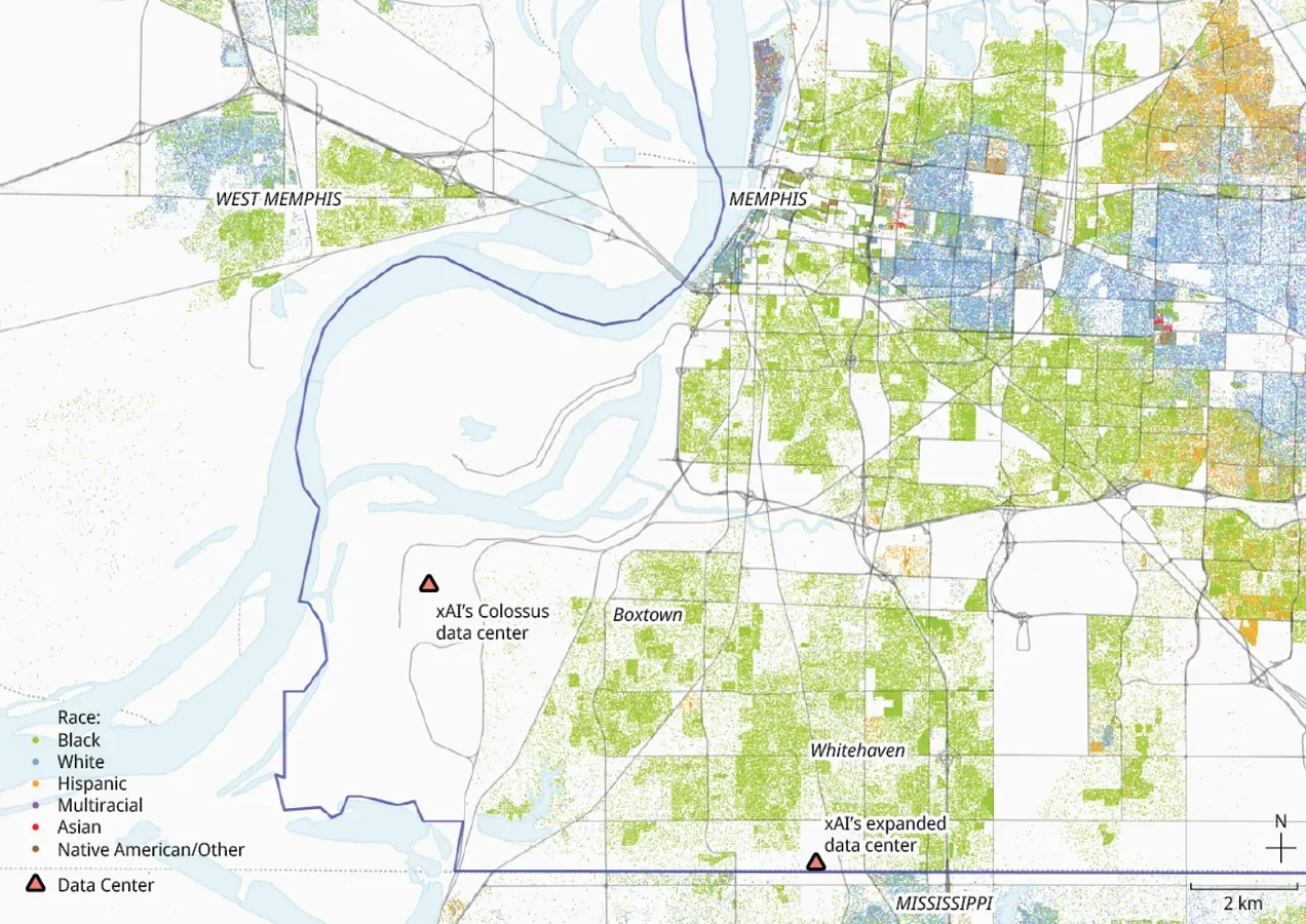 In late April 2025, hundreds of Memphis residents packed a high school auditorium to confront local officials over Elon Musk’s xAI data center. Residents from Boxtown—a historically Black, heavily polluted neighborhood—voiced outrage over the company’s unpermitted gas turbines, degraded air quality, and massive water withdrawals from a strained aquifer. Protesters, state representatives, and environmental lawyers denounced the project’s lack of transparency, calling it just the latest exploitative industrial venture imposed on the community without consent. For many, the xAI supercomputer was not a symbol of innovation but a stark reminder of the region’s long-standing environmental racism and structural exploitation.
