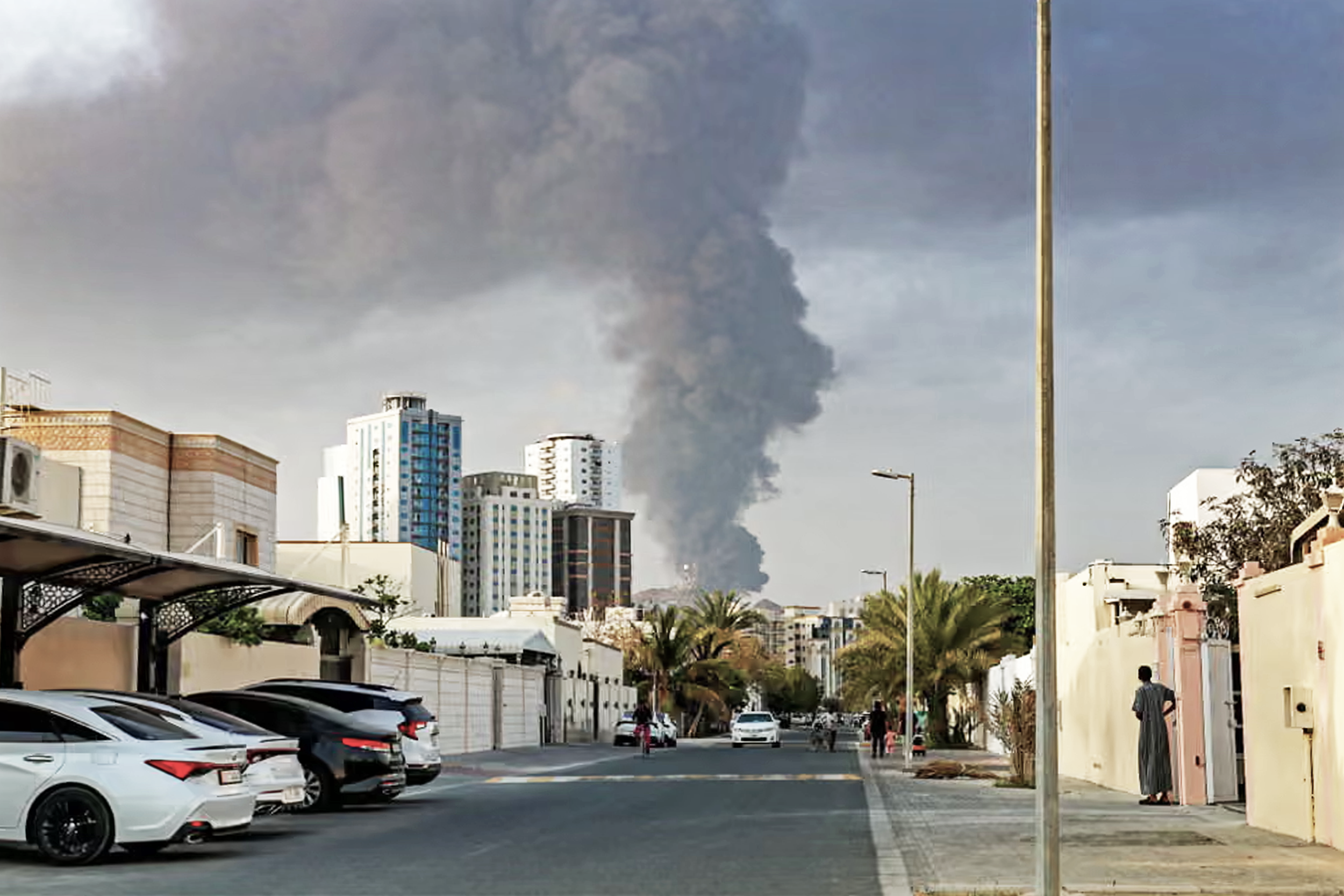 People watch from a street as a tall smoke plume billows following an explosion in Fujairah’s industrial zone in the UAE, March 3, 2026. (Photo by Fadel Senna)